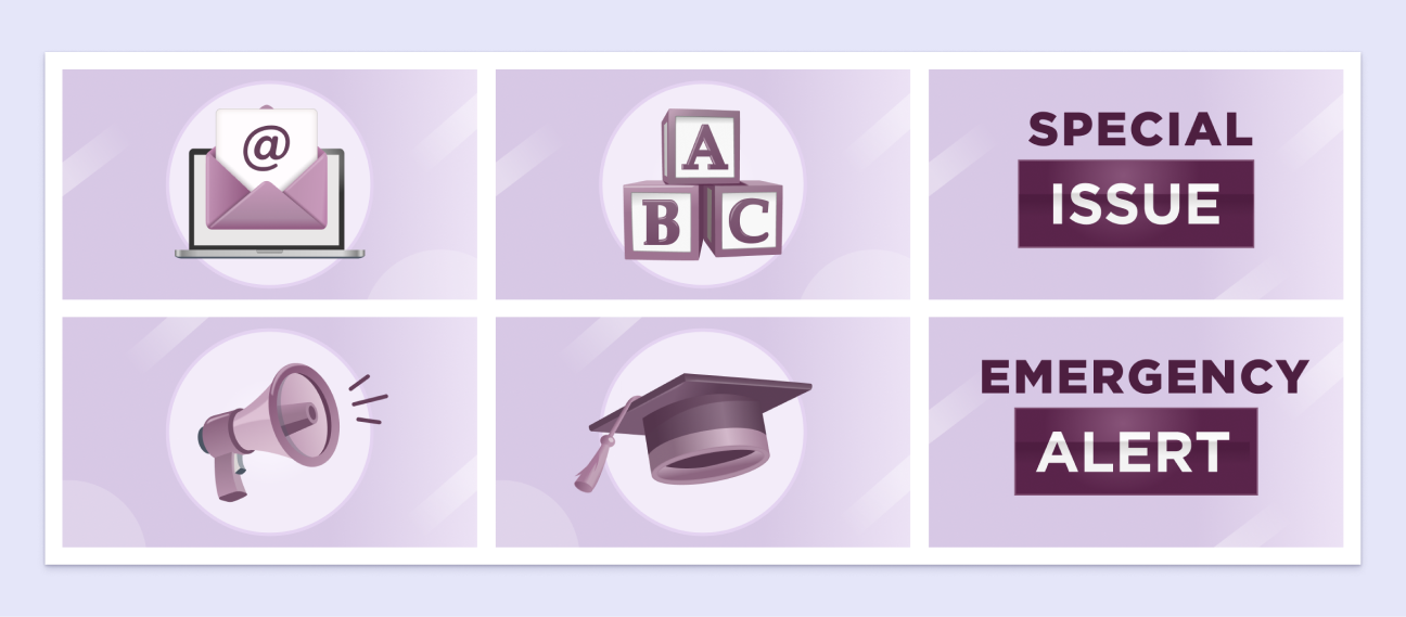 I designed new icons and card components for newsletters called 'Education bulletins'. I used playful symbols in a simple, flat style to represent the different topics. For colours, I used brand purples and tints from the MOE design system.